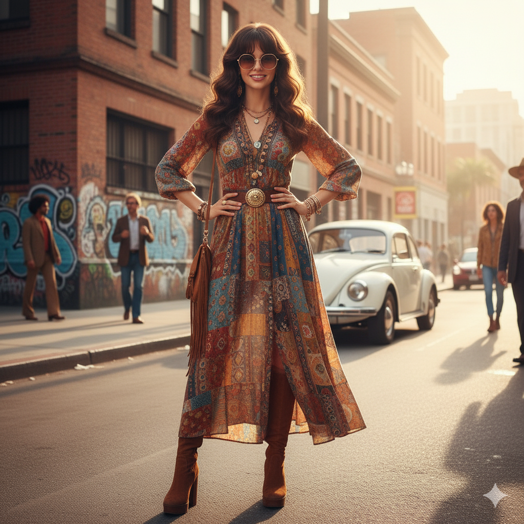 “Render this woman as a 1970s street goddess. Keep her exactly as in the provided photos — no alterations to the face or body.”