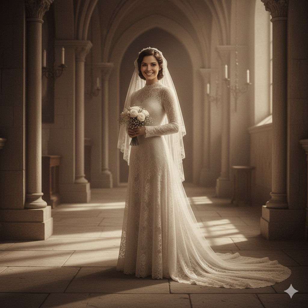 “Create a period-style 1930s bride in a lace-train gown, draped and flowing. Use old-world, sepia-toned romantic lighting and soft chapel shadows that highlight the face. The image should evoke a distant memory; do not alter the face — keep it exactly as in the reference.”