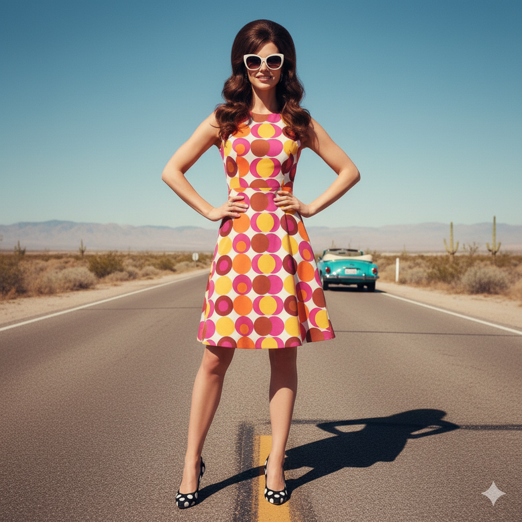 “Give this woman a 1960s roadside aesthetic: a desert road, cat-eye sunglasses, and slippers with black dots. The image should feel distinctly ’60s — fresh, sunlit, and a little designer. Keep the body and face identical to the reference; no alterations.”