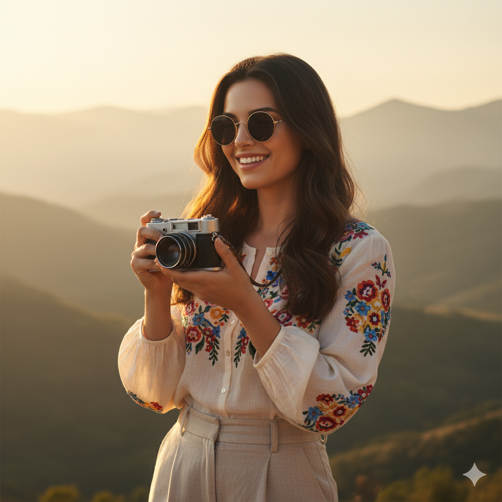 “Portrait of a young woman holding a vintage camera during golden hour. Waist-length dark brown hair with light curls, silvery skin, and large round sunglasses. She wears a cream blouse with embroidered flowers and high-waisted beige slacks. Lit from one side by warm, soft yellow light against gently misty mountains. Focus carefully on upper body and face: cinematic composition, realistic textures, and natural shadows.”