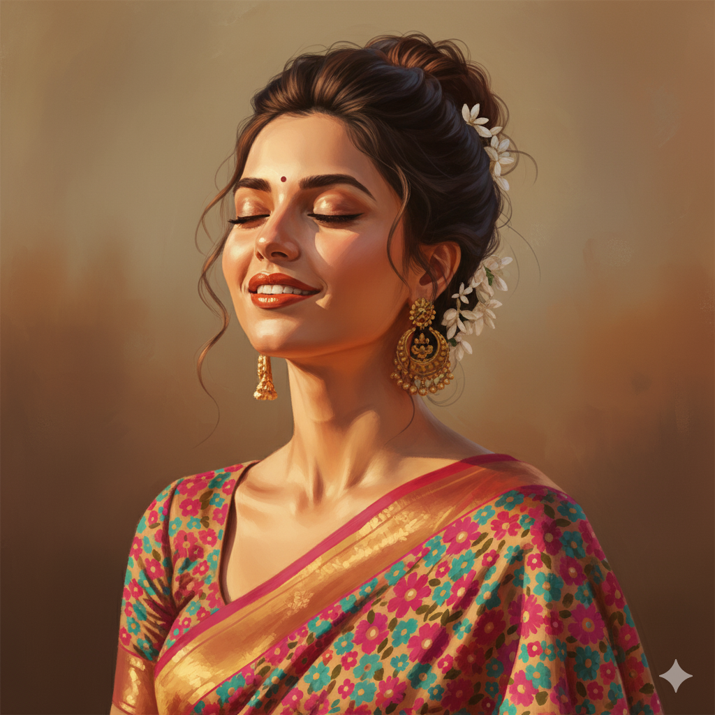 “Paint a retro-inspired woman with bold Windsor-orange, true red, or teal lips wearing a bright sari patterned with tiny repeated florals. Her hair is piled messily on top; a braid’s soot tightens her choti slightly at the left temple. Tiny jasmine flowers behind her ears and an old-style earring. She closes her eyes as warm light bathes her, creating a caressing, reverent glow. Keep the face exactly as in the reference — untouched.”