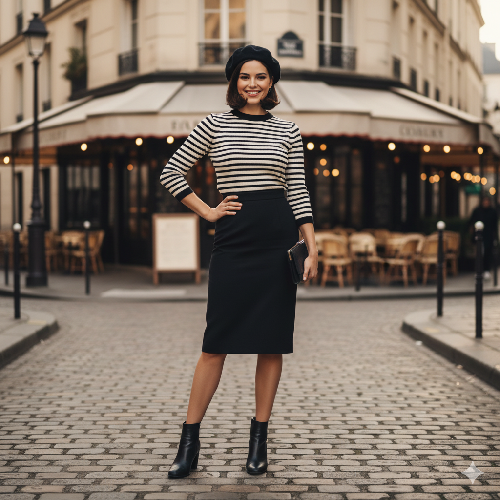 “Imagine a 1960s Parisian fashion woman: fitted striped knit, beret, and pencil skirt. She poses confidently with one hand on her waist and a leather clutch in the other. Place her on a cobblestone street with a classic Parisian café and warm natural light. Preserve the face exactly as in the reference photo.”
