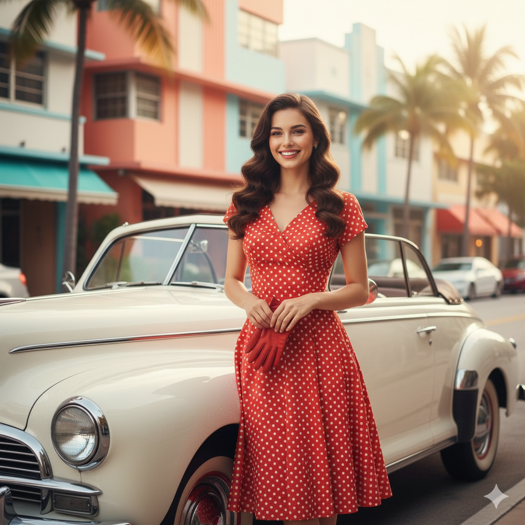 “Recreate this woman in a classic 1940s look: Parisian curls, matching red polka-dot dress, and a classic car. Apply a few vibrant tones for a timeless, Miami-style portrait that reads as elegant, vintage, and nostalgic.”