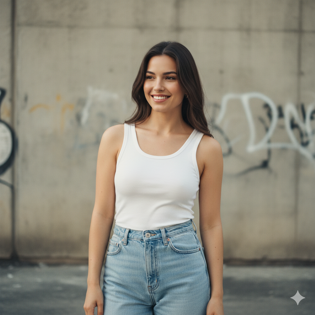 “Portrait of a boy with soft, minimal makeup. He (or she, if the reference is female) wears a white tank and blue high-waisted ‘mom’ jeans, standing against a dull textured wall in an urban setting. Natural, soft light to emphasize casual, timeless 90s style. Keep the face exactly as in the reference photo.”