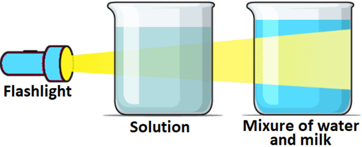 When a beam of light passes through a colloid, the colloidal particles present in the solution do not allow the beam to completely pass through. The light collides with the colloidal particles and is scattered (it deviates from its normal trajectory, which is a straight line). This scattering makes the path of the light beam visible, as illustrated below.