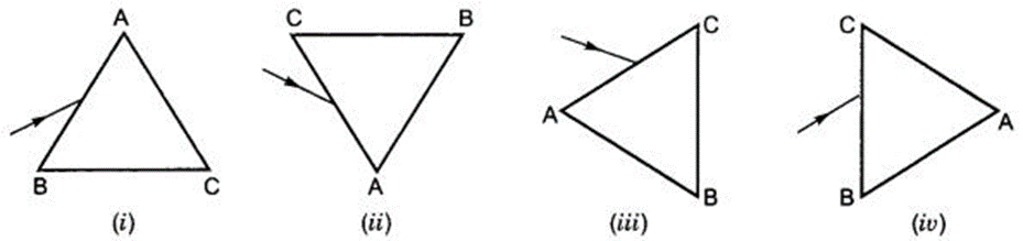 3. A prism ABC (with BC as base) is placed in different orientations. A narrow beam of white light is incident on the prism as shown in the Figures given below. In which of the following cases, after dispersion, the third colour from the top corresponds to the colour of the sky?